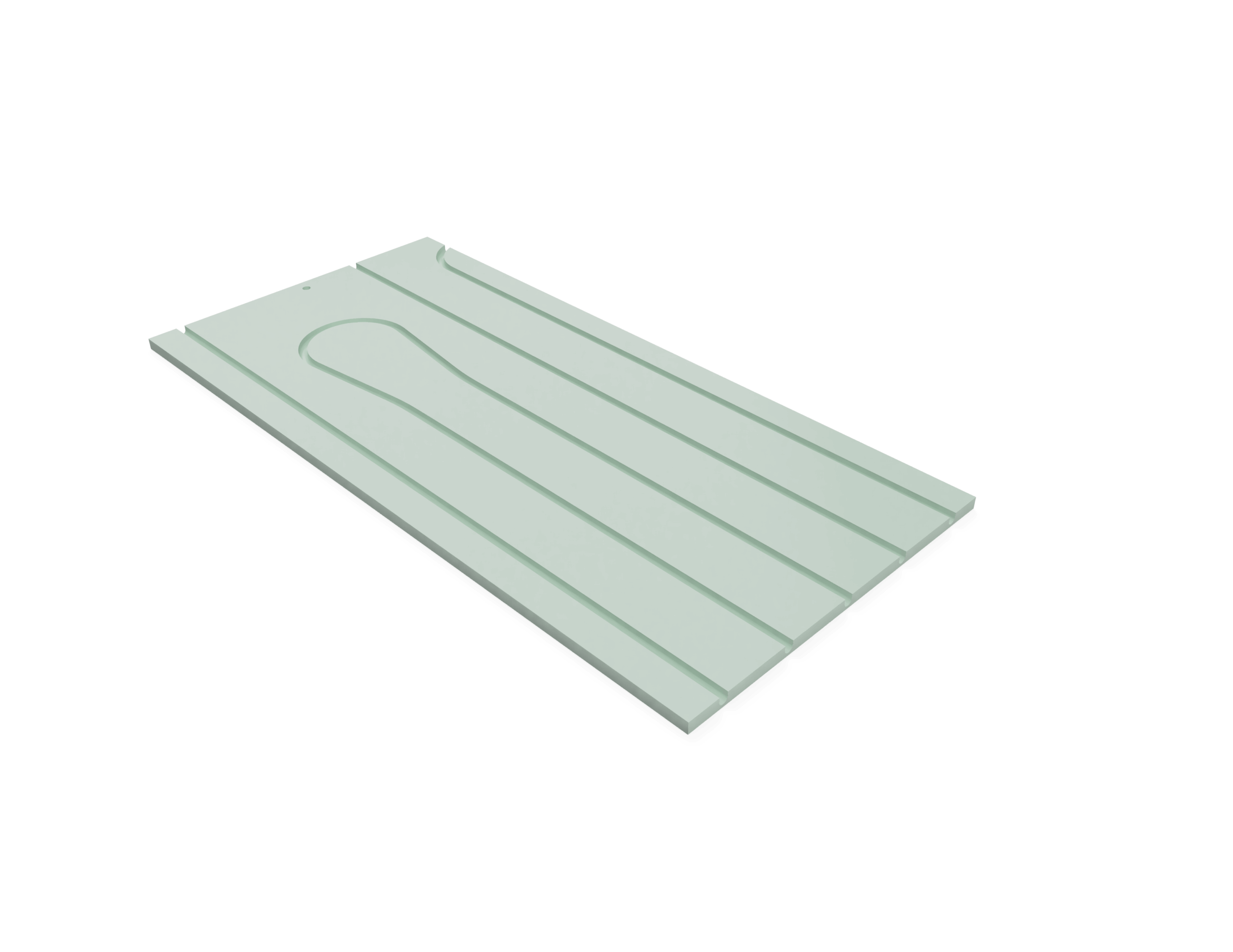 Mit dieser Platte beginnt, nach Verlegung der Verteilerplatten, die Verlegung der flächigen für Räume konzipierten Platten. Über die geraden Anschlusskanäle erfolgt die Verbindung zu den kleineren Verteilerplatten. Der AV-Platte liegt immer eine BU-Platte gegenüber. Kennzeichnung der AV-Platte ist ein Fräspunkt und sie kann anhand der geraden Anschlusskanäle intuitiv mit den Verteilerplatten verbunden werden. Hier ist sowohl Start als auch Ende eines Doppelmäanders innerhalb eines Heizkreises.